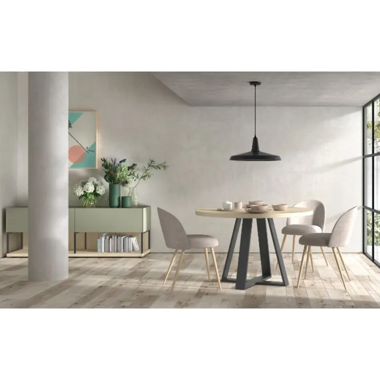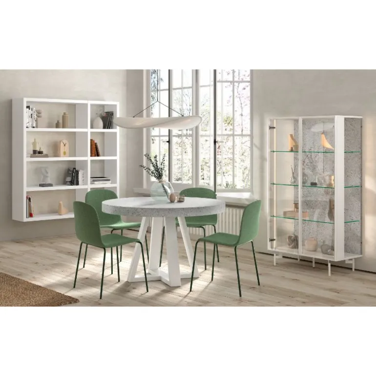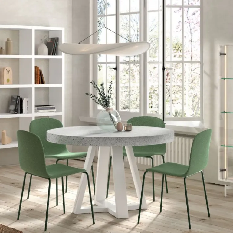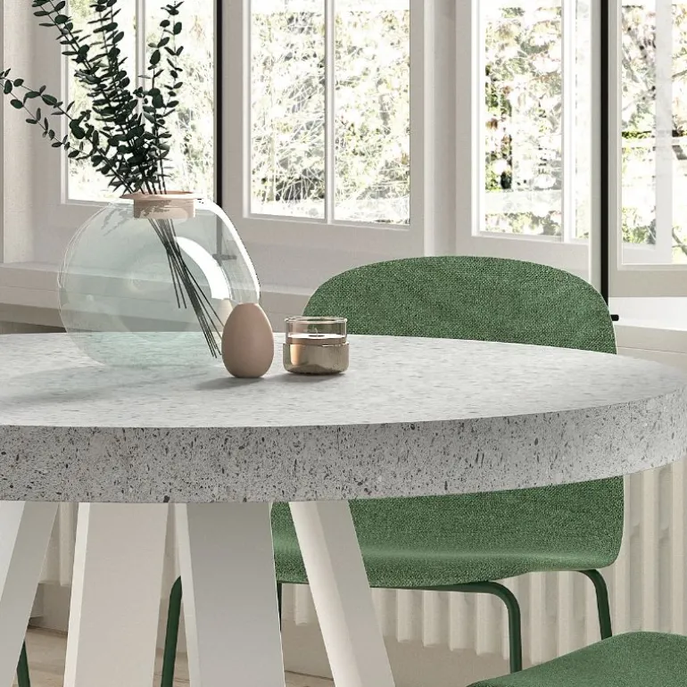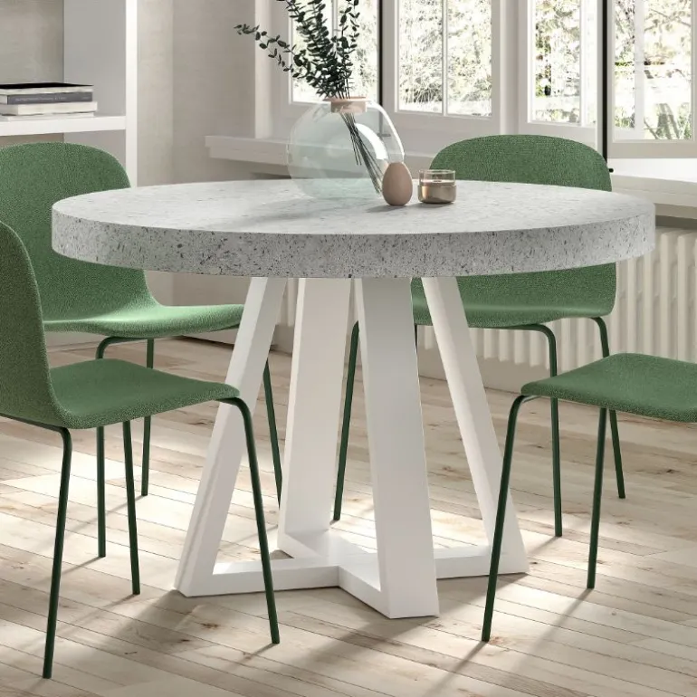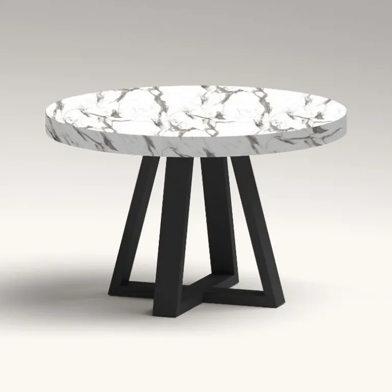 Mesa redonda cruz piedra. Estupenda mesa de comedor que destaca por su tapa imitación Piedras o Mármoles a escoger, y sus patas de madera a escoger acabado, así cómo su gruesa tapa de 4 cm u 8 cm, diferente a la mayoría de muebles que podemos ver, vanguardista y muy elegante. Acabado Lava Stone. Todo ello con patas en acabado Laminado Blanco.
