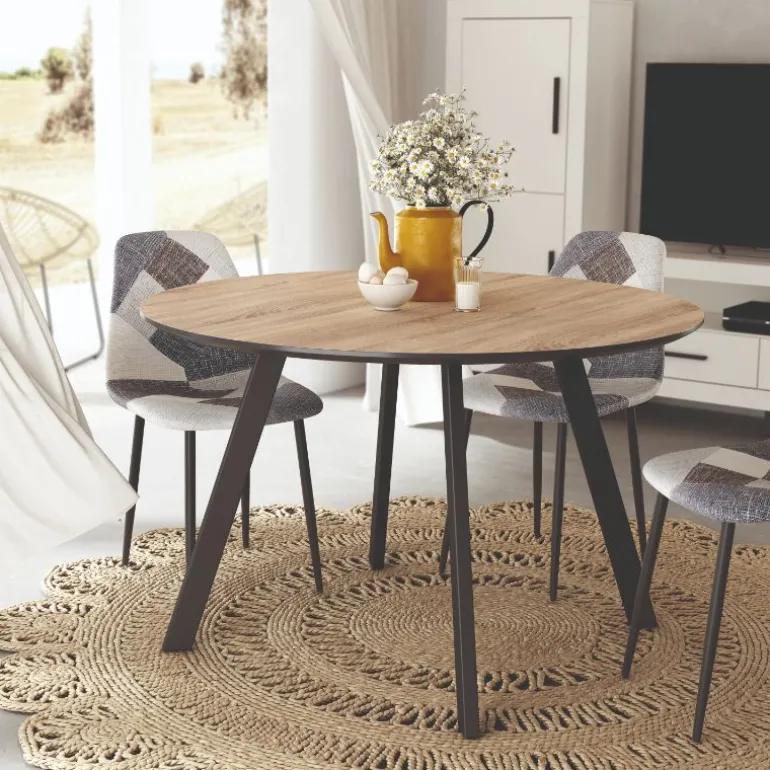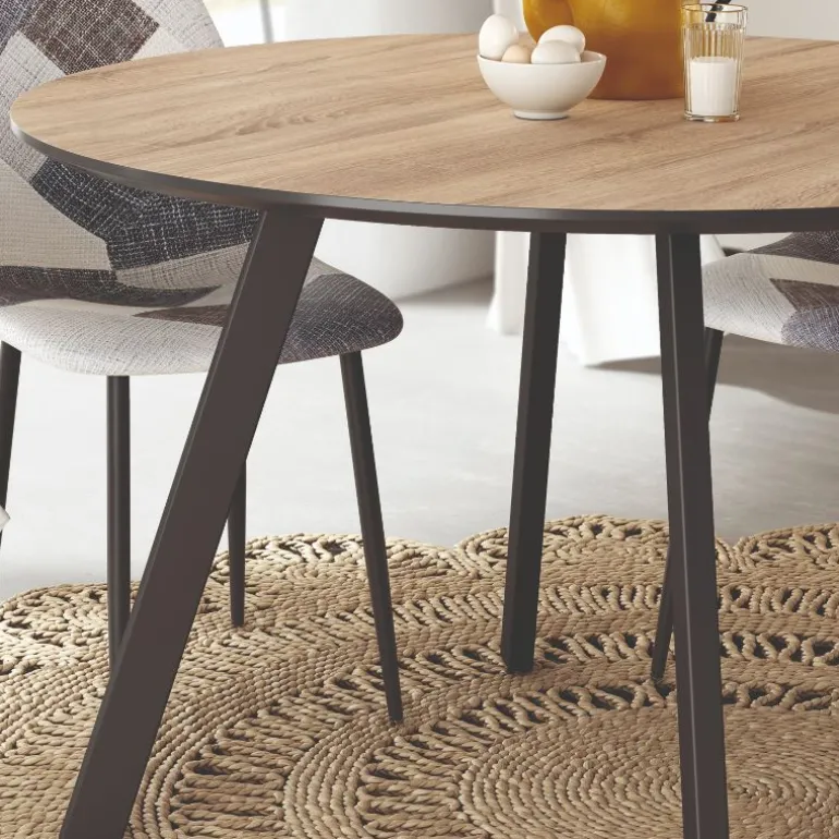 Mesa redonda Duane con patas de hierro en acabado metálico negro, un acabado en ecomadera muy resistente. Mesa redonda Perfecta para de 4 a 6 comensales. Una mesa de comedor con un diseño muy actual, de estilo industrial urbano, pero que encaja en cualquier tipo de decoración a la perfección. Escoge la combinación que encaje mejor con tu estilo. También disponible con tapa en combinaciones diferentes maderas, con diferentes acabados a escoger de ecomadera.