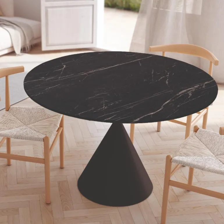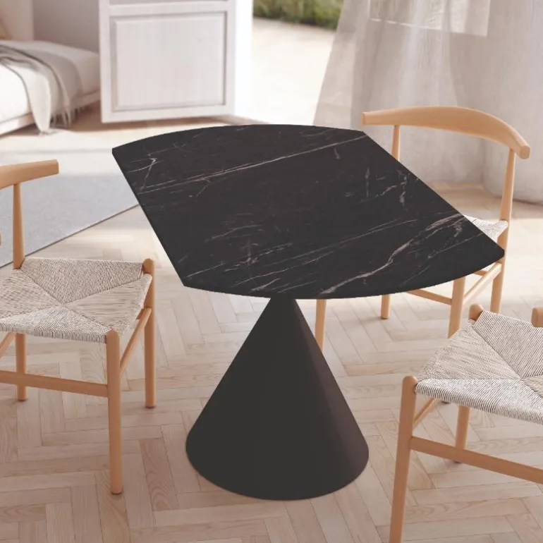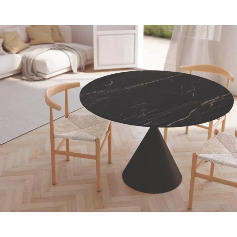 Sobre porcelánico de 12 mm en diferentes acabado piedrasa escoger, con pata metálica en forma cónica, a la última en decoración, que hará las delicias de tus comensales, en acabado negro (También en marfil). Perfecta para espacios reducidos, de 120 cm.