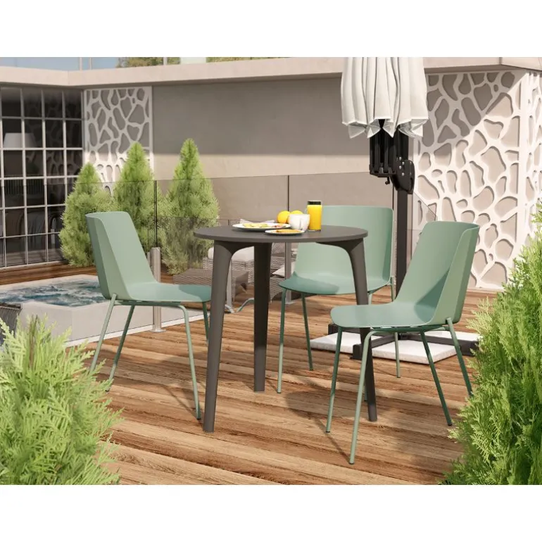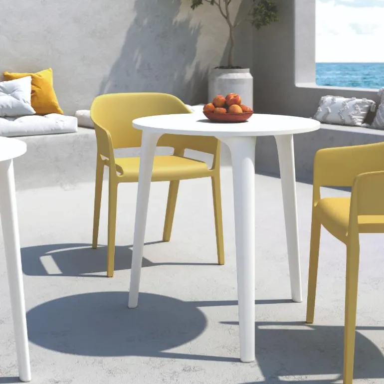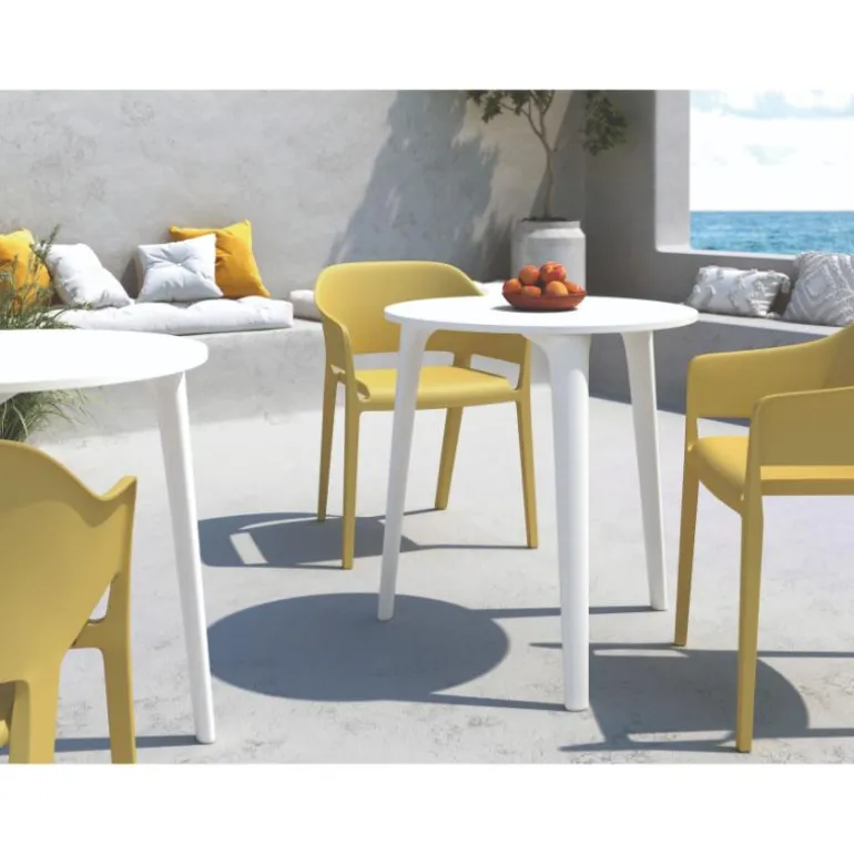 Mesa redonda terraza xara apta para uso en exterior, con patas y sobre de polipropileno reforzado muy resistente. En Blanca o Grafito a escoger. Mesa redonda Perfecta para de 3 – 4 comensales, perfecta para terrazas con poco espacio. Una mesa redonda con un diseño muy actual, de estilo industrial urbano, pero que encaja en cualquier tipo de decoración a la perfección. Escoge la combinación que encaje mejor con tu estilo.