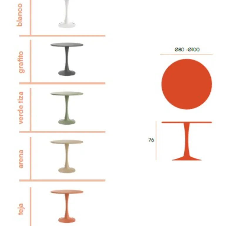 Mesa redonda terraza Piccola con pata central, estructura y sobre metálicos (acero barnizado a polvo epoxi) apta para exterior, muy resistente. En 5 colores a escoger. Mesa redonda Perfecta para de 2 – 4 comensales, perfecta para terrazas con poco espacio, disponible en dos medidas: 80 y 100 cm de diámetro. Una mesa redonda con un diseño muy actual, de estilo industrial urbano, pero que encaja en cualquier tipo de decoración a la perfección. Escoge la combinación que encaje mejor con tu estilo.