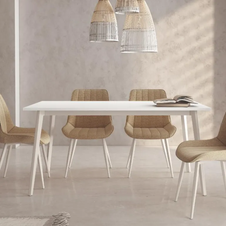 Mesa Thane, Mesa de comedor con sobre en diferentes acabados de eco-maderas y lisos a escoger, con patasmetálicas en acabado blanco (Disponible con patas negras en ésta web). Perfecta para espacios reducidos, en cuatro medidas de 120, 140, 160 y 180 cm, para de 4 a 8 comensales. Mesa de comedor con un diseño muy actual, de estilo industrial y urbano, pero que encaja en cualquier tipo de decoración a la perfección. Escoge la combinación que encaje mejor con tu estilo, las posibles combinaciones diferentes de maderas, con diferentes acabados a escoger en melamina hiperrealista, con la beta y nudos de la madera.
