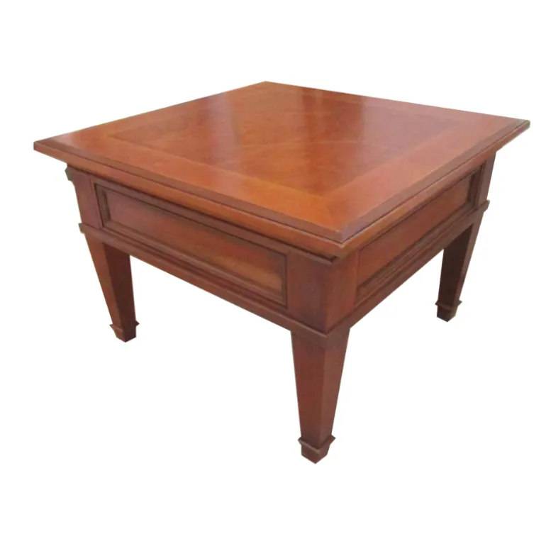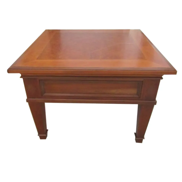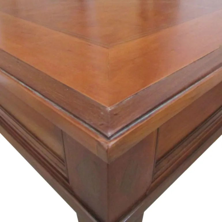 Rústica mesilla auxiliar cuadrada con detalles tallados en madera. Incluye un cajón lateral muy práctico. Esta fabricado en madera de Cerezo maciza, en un preciosos tono rojizo del Cerezo, con acabado natural de tacto fino y tiradores de hierro forjado pulidos.