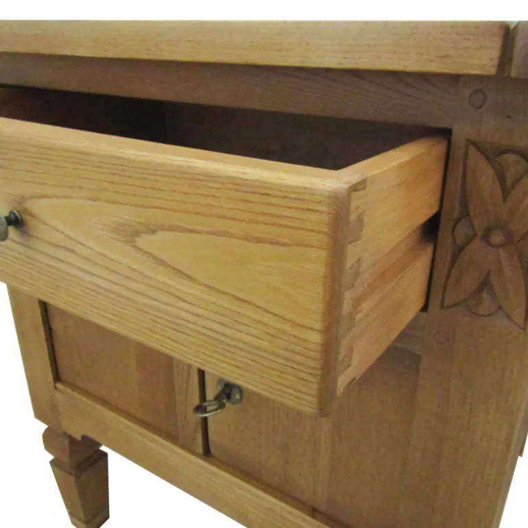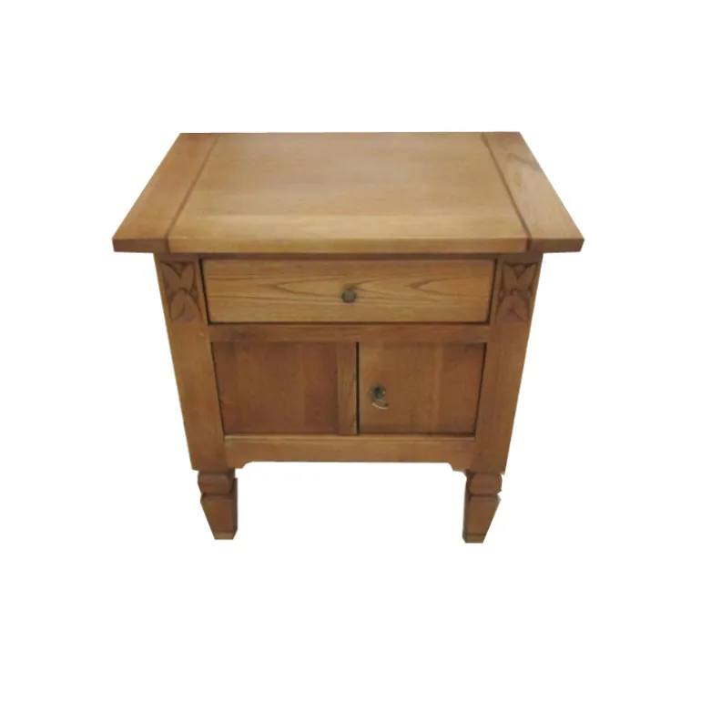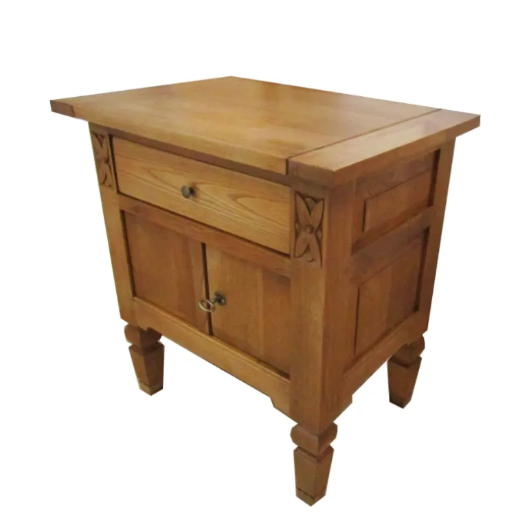 Rústica mesilla auxiliar cuadrada con un cajón superior y 2 puertas con una balda interior, para poder almacenar todo aquello que necesites. Esta fabricado en madera de Roble maciza, con acabado natural de tacto fino y tiradores de hierro forjado pulidos.