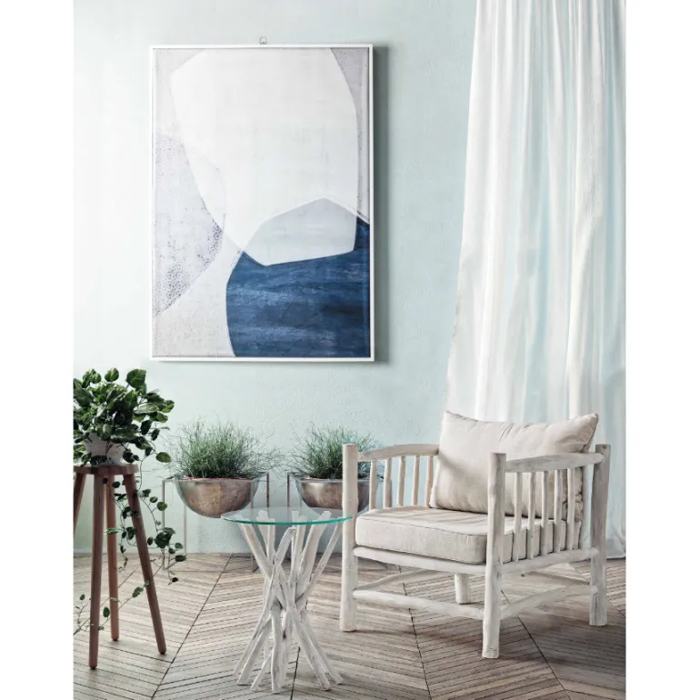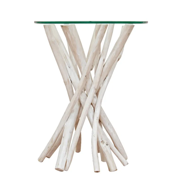 Mesita auxiliar de ramas de Teca maciza, decapadas con acabado a la cera. Y vidrio circular de 8mm. de grosor.