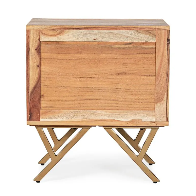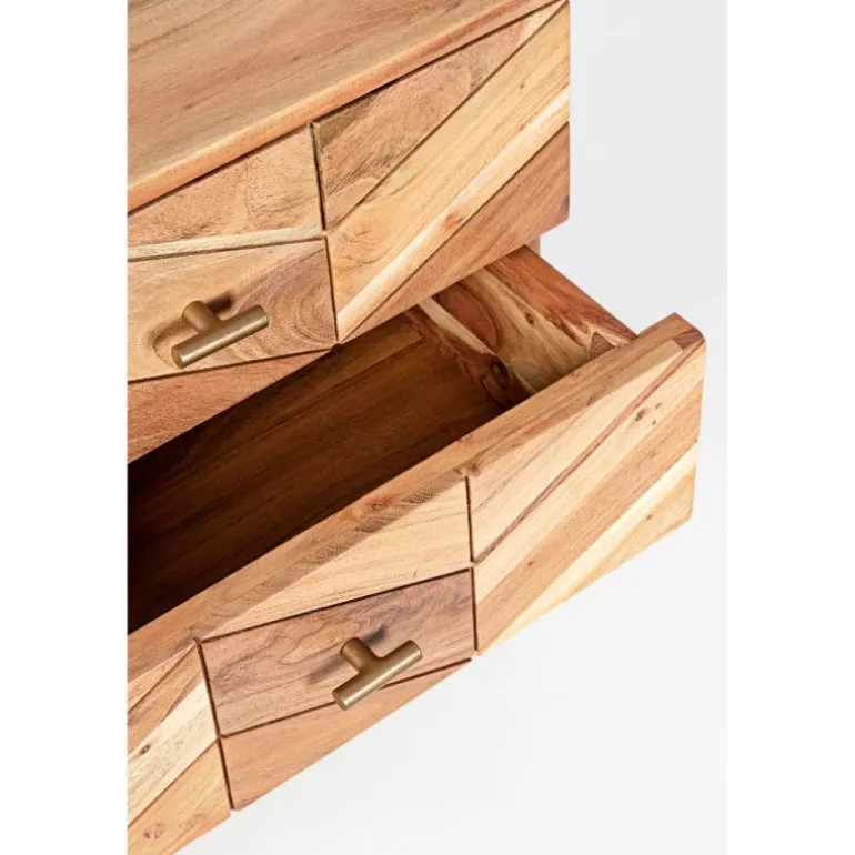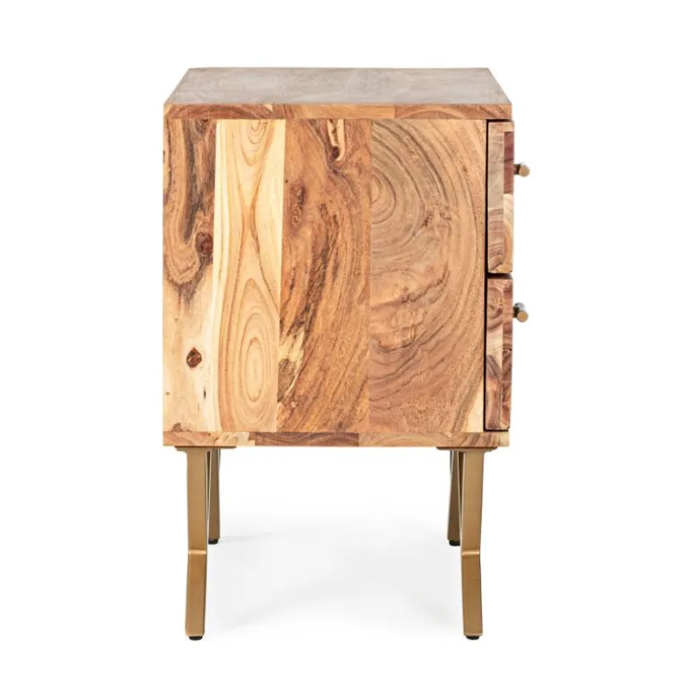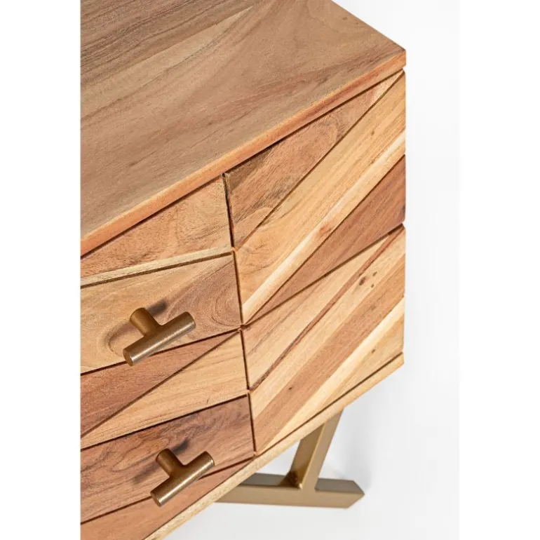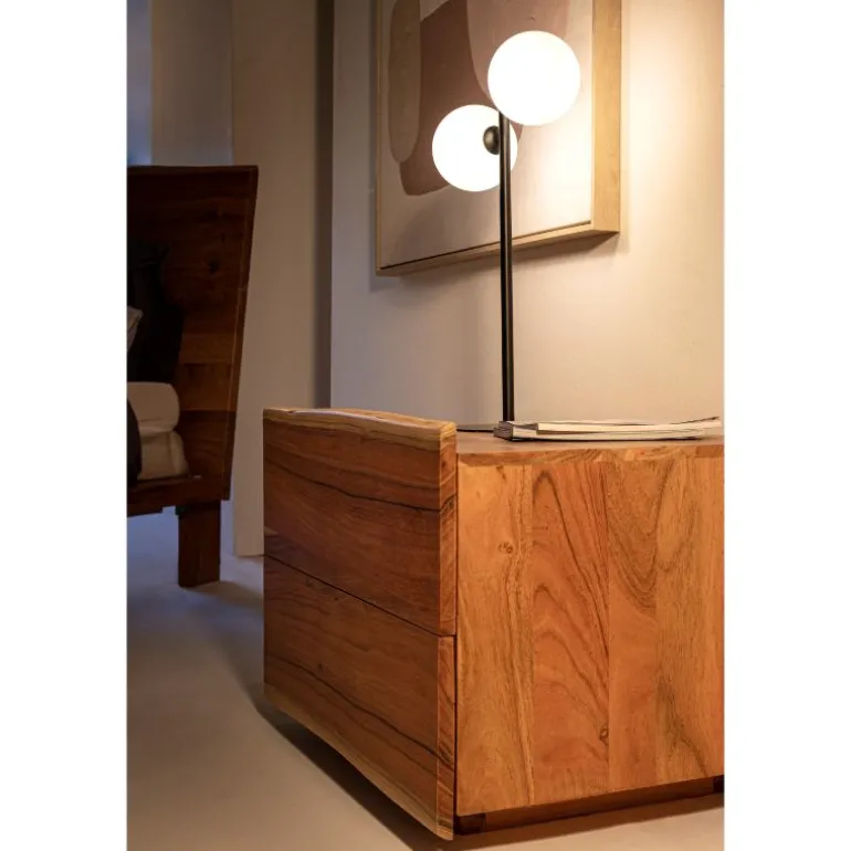 Estructura de madera de acacia. acabado a base de barniz de poliuretano. patas de acero barnizado a polvo epoxy. patas metálicas para montar. Las formas de la madera son indicativas, cada aparador es diferente y único. Dispone de 2 cajones amplios.