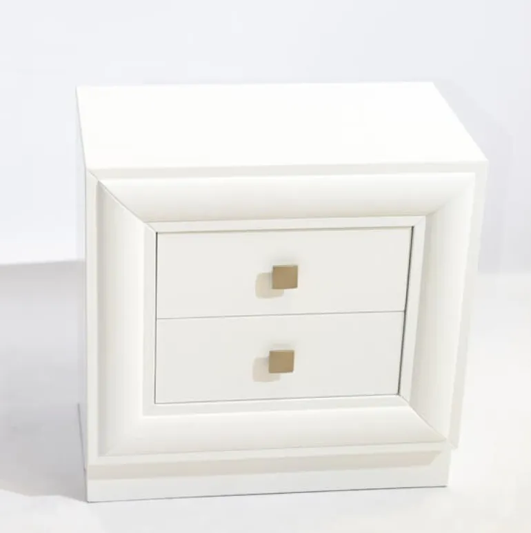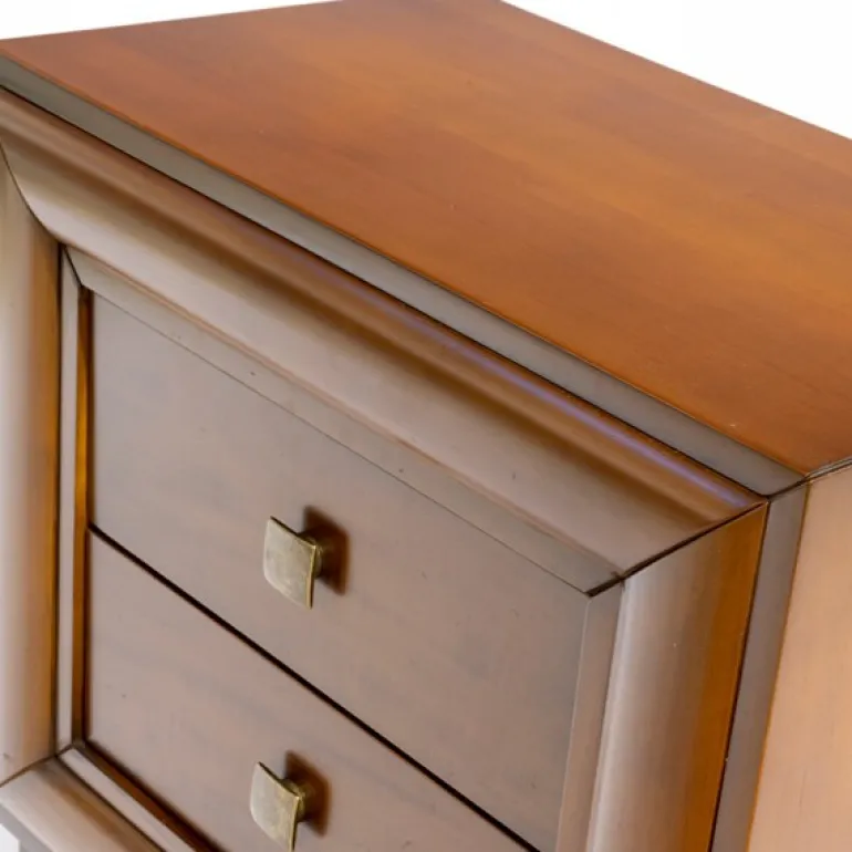 Sencilla mesilla de chapa natural Aliso (familia del cerezo), suave y patinado para resaltar todas sus molduras y formas, acabado en elegante nogal. De diseño contemporáneo, que encajará con cualquier decoración, y el resto de sus muebles. Mesillas con tiradores en forma cuadrada acabado oro envejecido y con 2 cajones con guías metálicas. Ideal para dormitorios estilo contemporáneo.