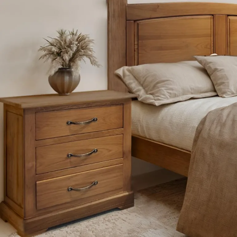 Mesilla de noche con 3 cajones, fabricada en madera 100% roble maciza con gran calidad de construcción. Con cómodos tiradores y plafón decorativo en los laterales. Barnizado a base de patinas tonos robles para resaltar todas sus molduras y formas.