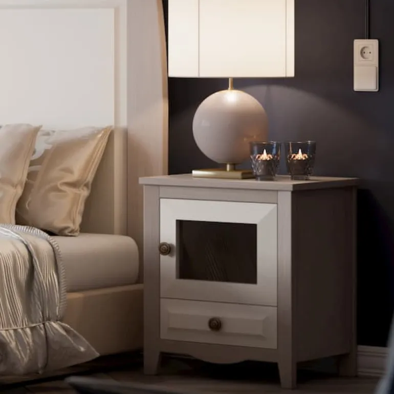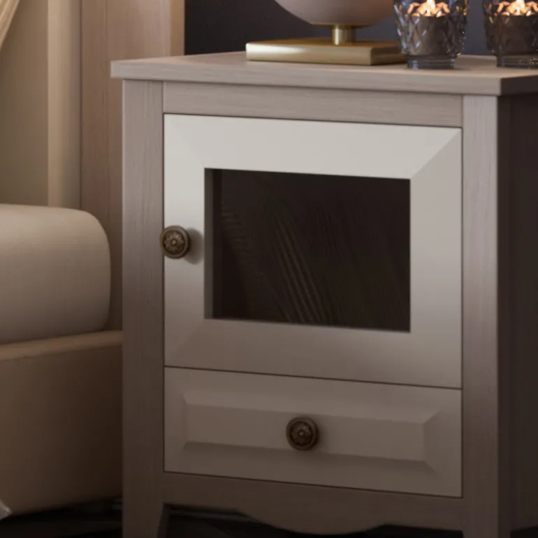 Mesita de noche paracama de matrimonio en acabado chapa roble natural, conuna puerta de cristal y 1 cajón inferior con el frente enmarcado, en chapa de roble natural, con un tercer cajón pequeño superior para guardar el teléfono, libro, reloj, etc. Un contraste de acabados que otorga elegancia,moderno y ligero. Con la posibilidad de escogerlo con 3 cajones en lugar de puerta de cristal, los dos inferiores con el frente enmarcado y el superior más pequeño liso.