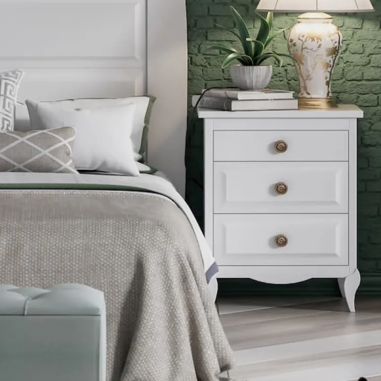 Mesita de noche paracama de matrimonio con 2cajones con el frente enmarcado, enacabado lacadoblanco, con un tercer cajón pequeño superior para guardar el teléfono, libro, reloj, etc. Un contraste de acabados que otorga elegancia,moderno y ligero.