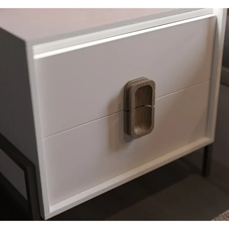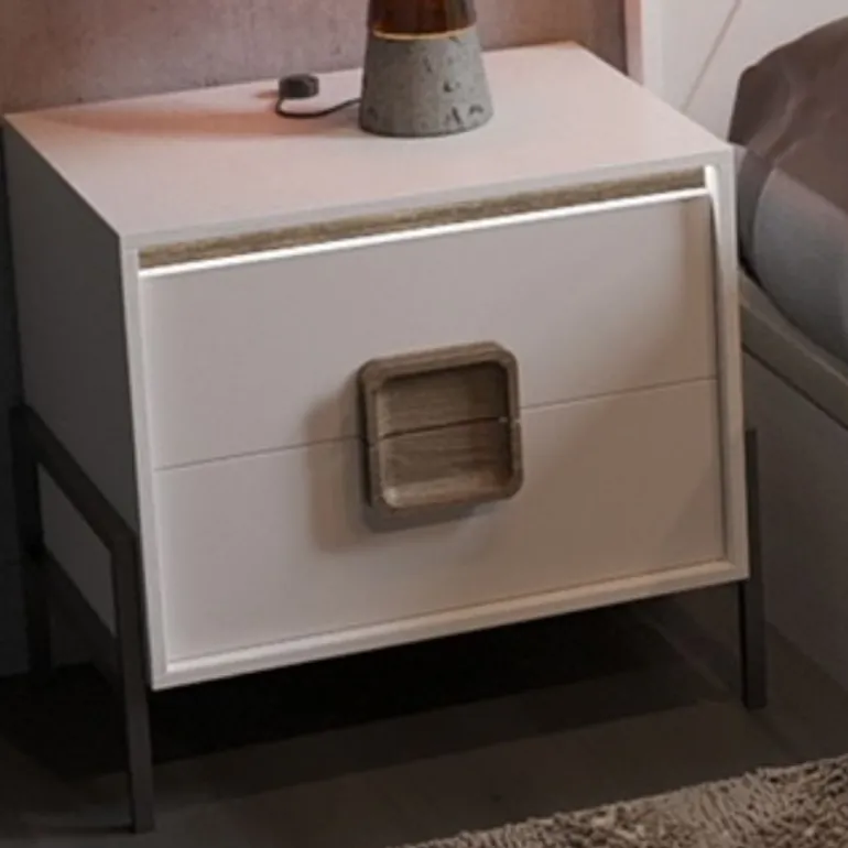 Mesillas para cama de matrimonio con 2 cajones, acabado Lacado Blanco para el Frente del cajón, Chapa de Roble N-20 el Detalle de láminas paralelas del cajón superior, y Lacado Blanco el Armazón (Segunda imagen: Lacado Piedra Frente, Lacado Blanco Detalle, y Roble N-20 Armazón), que le otorga un contraste muy moderno y ligero. Perfecto para dormitorios de matrimonio modernos. Con Luces LED indirectas en la parte superior de los cajones. Con apertura con tirador, ideal para guardar libros, smartphone, etc.
