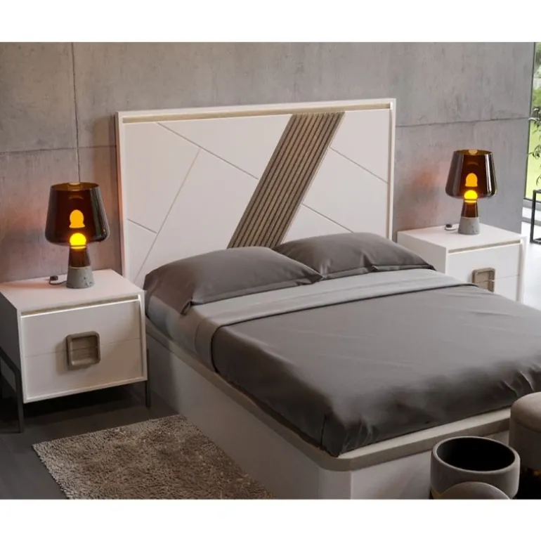 Disponible Cabecero a juego para cama de matrimonio, acabado Lacado y en chapa natural de roble con nudos, que le otorga un contraste muy elegante, moderno y ligero.