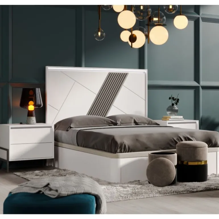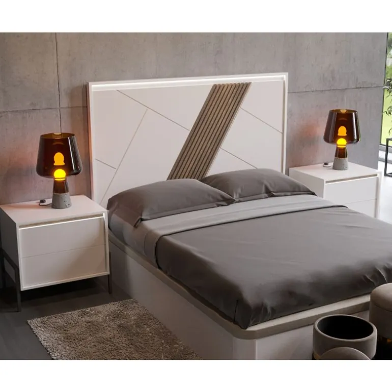 Mesillas para cama de matrimonio con 2 cajones, acabado Lacado Blanco para el Frente del cajón, y Lacado Blanco el Armazón, con opción de Detalle de láminas paralelas en el cajón superior (Detalle Lacado Grafito), que le otorga un contraste muy moderno y ligero. Perfecto para dormitorios de matrimonio modernos. Con Luces LED indirectas en la parte superior de los cajones. En 2 medidas diferentes a escoger. Con apertura de uñero, ideal para guardar libros, smartphone, etc.