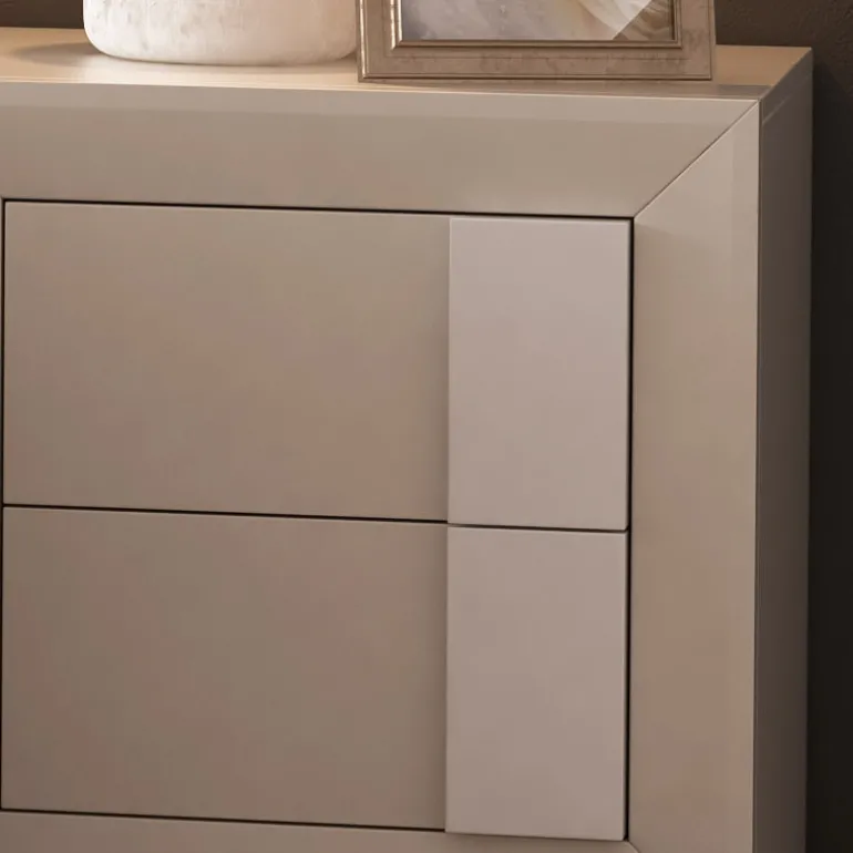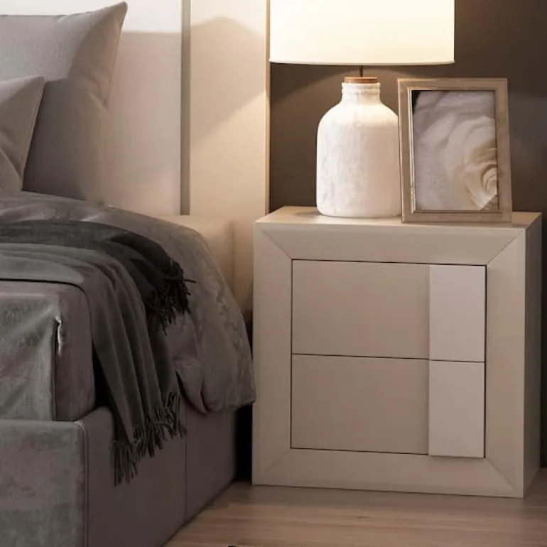Mesita de noche paracama de matrimonio, acabadolacado crema 0597y tiradores enlacado blanco, que le otorga un contraste muy elegante,moderno y ligero.