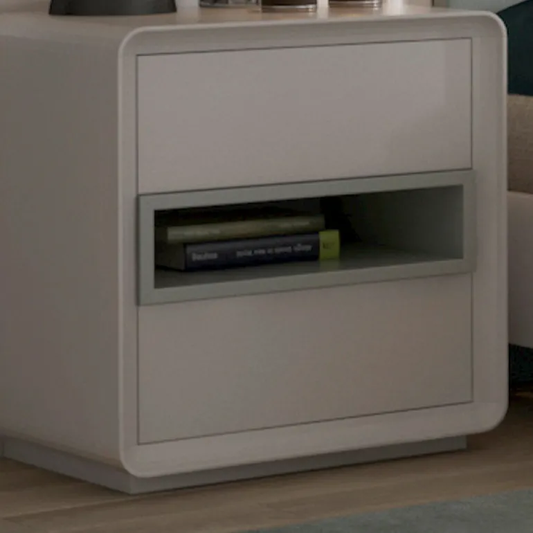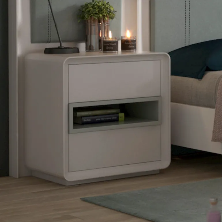 Mesita de noche paracama de matrimonio, acabado enlacado blanco, que le otorga un contraste muy elegante,moderno y ligero.Con un hueco central en lacado gris, para guardar libros, smartphone, etc.