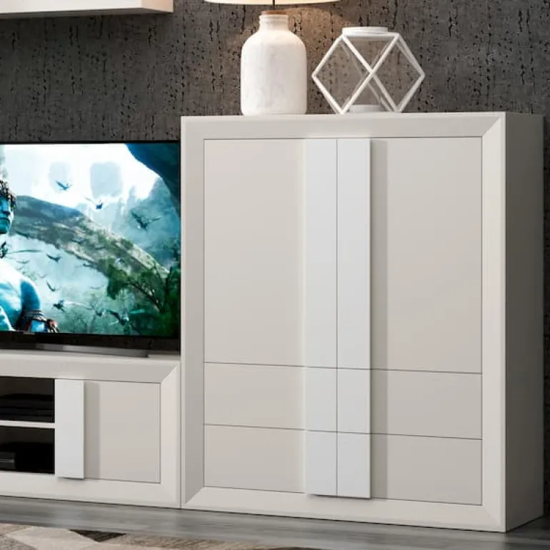 Compuesto por un mueble de TV con2 puertas, unmueble alto con2 cajones y1 puerta, un mueble bar con 4 cajones y 2 puertas, y un estante de pared. Acabadolacadoarmazón ytiradores en diferentes tonos, que le otorga un contraste muy elegante,moderno y ligero. Y si le sumamoselmueble alto con el interior del mismo acabado, nos aporta mucho más espacio de almacenaje para que puedas tener todo organizado, y el estante alto da fluidez a las diferentes alturas y completa los elementos decorativos.