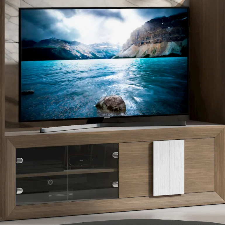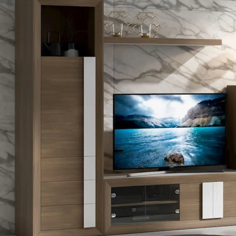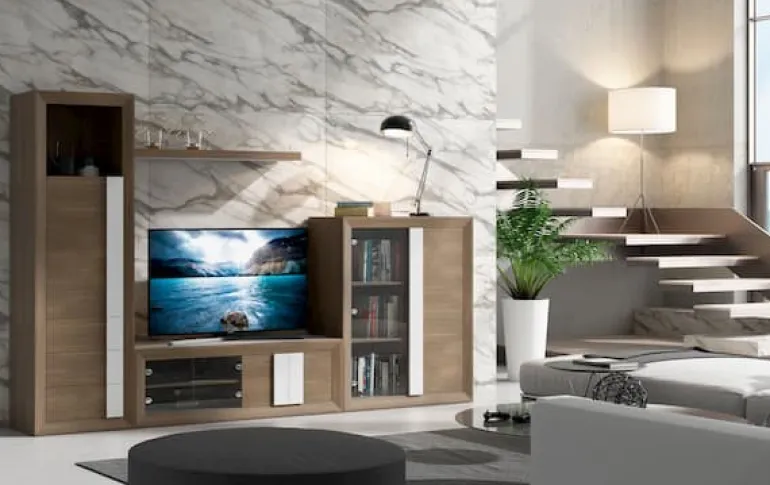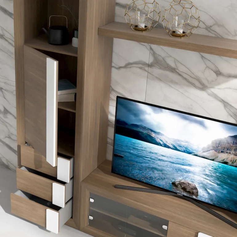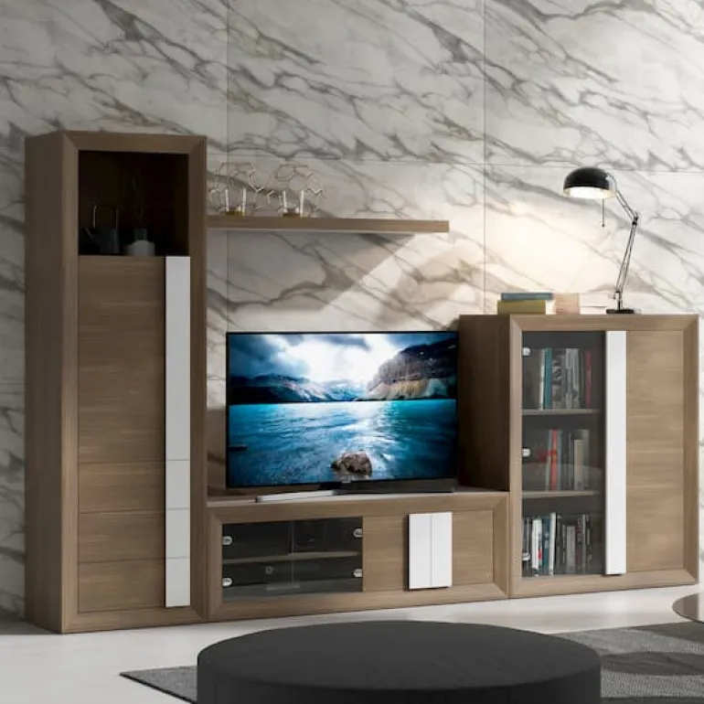 Compuesto por un mueble de TV con2 cajones y2 puertas de cristal, unmueble alto con 3 cajones y1 puerta, un mueble bar con 2 puertas una de ellas de cristal, y un estante de pared. Acabado en chapa de Roble teñida y los tiradores en poro abierto blanco, que le otorga un contraste muy elegante,moderno y ligero. Y si le sumamoselmueble alto con el interior del mismo acabado, nos aporta mucho más espacio de almacenaje para que puedas tener todo organizado, y el estante alto da fluidez a las diferentes alturas y completa los elementos decorativos.