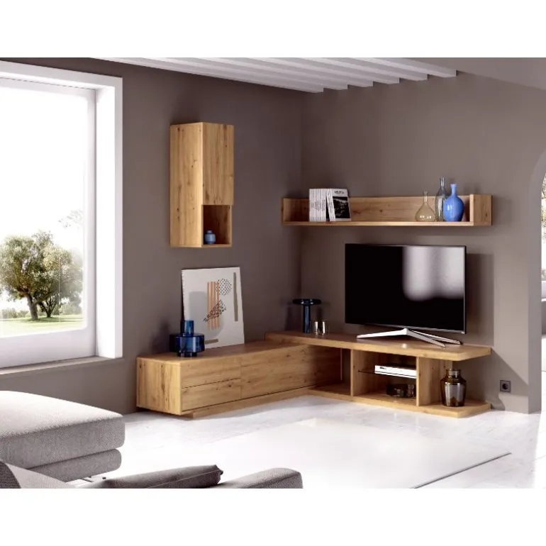 Mueble Salón esquinero Aada. Para quienes no disponen de mucho espacio en su salón, pero quieren un mueble de calidad y con espacio de almacenaje. De líneas rectas y depuradas mueble de televisión de estilo Nórdico.