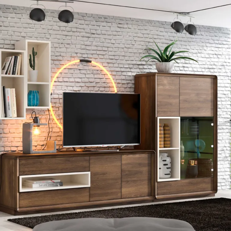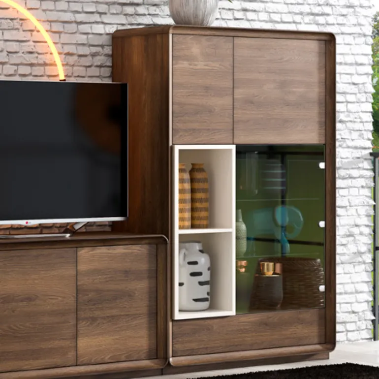 Compuesto por un mueble de TV con 2 cajones y2 puertas, y un hueco diáfano lacado, unmueble alto con2 puertas y 1 cajón y una vitrina con puerta de cristal, con 2 baldas de cristal, y un hueco diáfano lacado. AcabadoRoble y detalles enacabado lacado crema, que le otorga un contraste muy elegante,moderno y ligero.Con elmueble alto con el interior del mismo acabado, nos aporta mucho más espacio de almacenaje para que puedas tener todo organizado, yla vitrina permite ampliar loselementos decorativos.