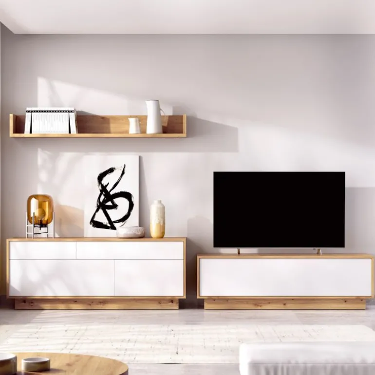Este mueble de salón incluye dos módulos, un módulo de TV bajo con puerta abatible, y otro módulo de TV alto con 2 cajones y 2 puertas: abatible y batiente. Con zócalo de 10cm, que se puede sustituir por otros apoyos. Lo completan una estantería en forma de U, para libros, elementos decorativos, etc.