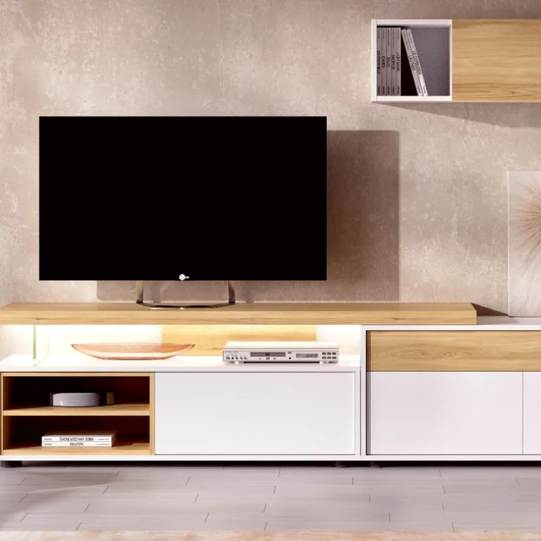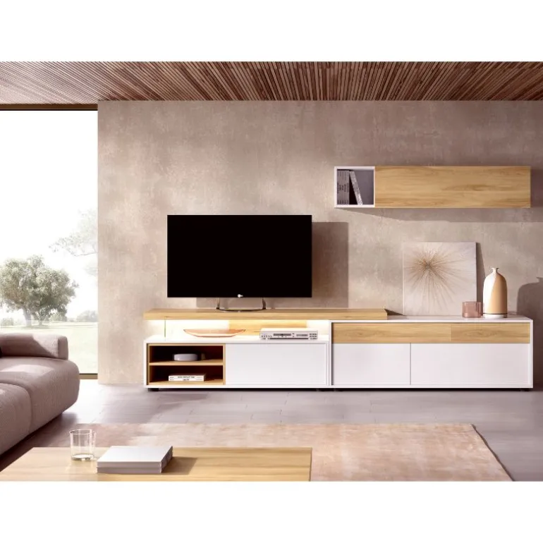 Sus líneas rectas y el juego de espacios y volúmenes que crea con el módulo bajo para la TV, compuesto por 2 módulos bajos, uno de ellos con puerta abatible y hueco diáfano con balda, para colocar los aparatos electrónicos, + una tarima sobre pata de metacrilato; y otro con 2 cajones, 1 puerta abatible (izq). y 1 puerta batiente (der.). También incluye un módulo alto colgado con puerta elevable. Ya sea en blanco, generando un espacio claro y luminoso muy moderno, o en contraste con una pared con un color fuerte, dotando al mueble de un gran protagonismo.