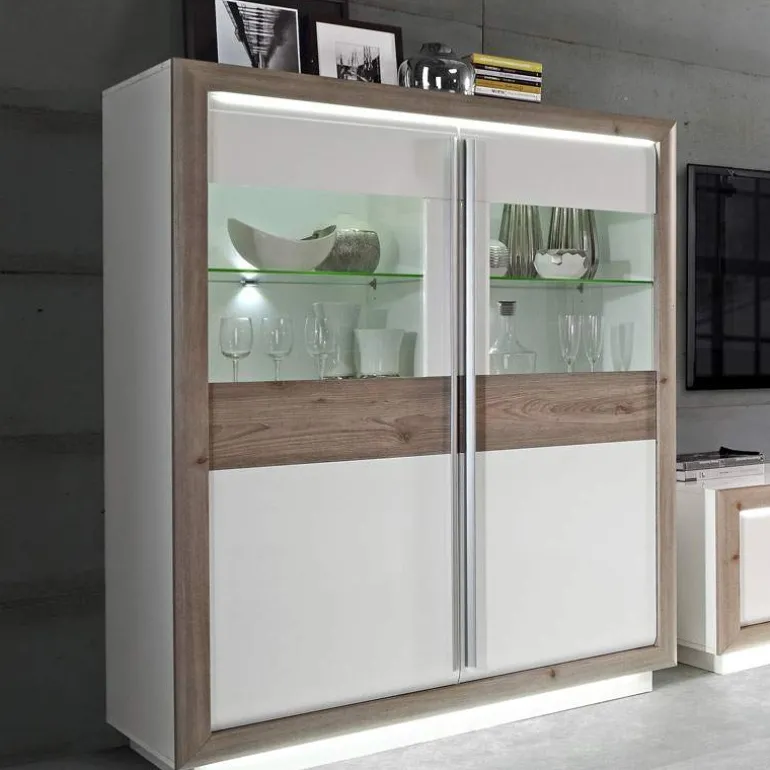 Este salón se compone de un mueble bajo de televisión con un cajón y dos puertas para guardar lo que quieras, y un hueco para los dispositivos electrónicos; una vitrina de dos puertas con gran capacidad de almacenaje. Ambos con la iluminación led incorporada, y con sistema de retención en puertas y cajones, para evitar golpes. Tiradores cromados.