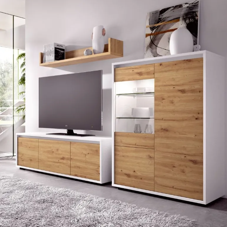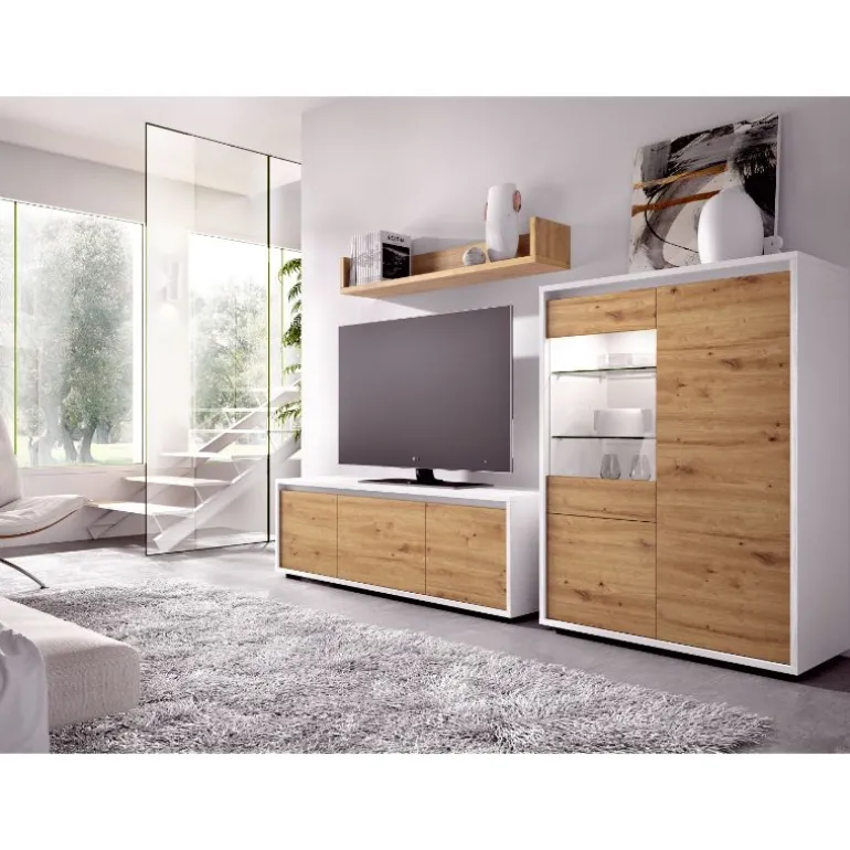 Mueble Salón Neida. Este mueble de Televisión está pensado para salones que no cuentan con mucho espacio o que no se los quiere sobre cargar. Con un mueble de televisión muy actual con 3 puertas y con posibilidad de cambiar acabados en cada una de las puertas y cajones que lo componen, y que lo hacen muy practico por su capacidad; y además un aparador con 2 puertas y 1 puerta de cristal, con baldas de cristal interiores, perfecto para elementos decorativos, etc. Además incluye una estantería de pared en forma de U con trasera.