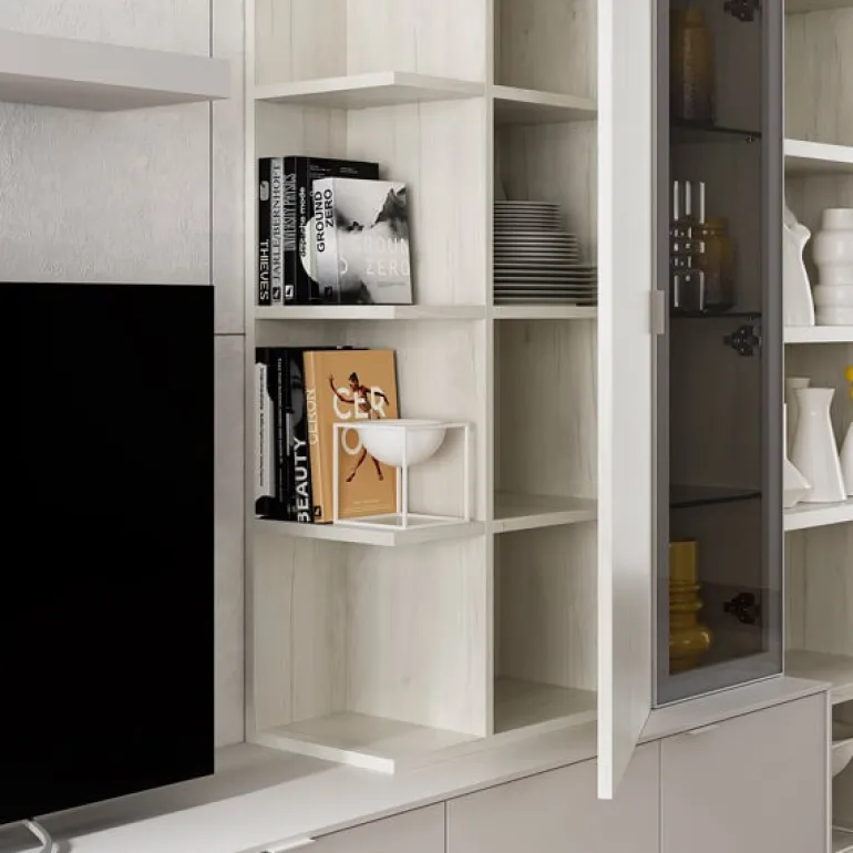 Mueble Salón Ohio, mueble de tv de 3,18 metros que destaca por su capacidad. Combinando en el mismo frontal, estanterías tradicionales sin puertas, vitrinas y estanterías con visibilidad lateral.