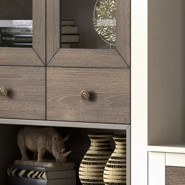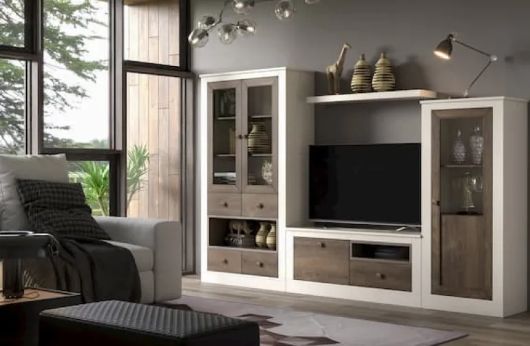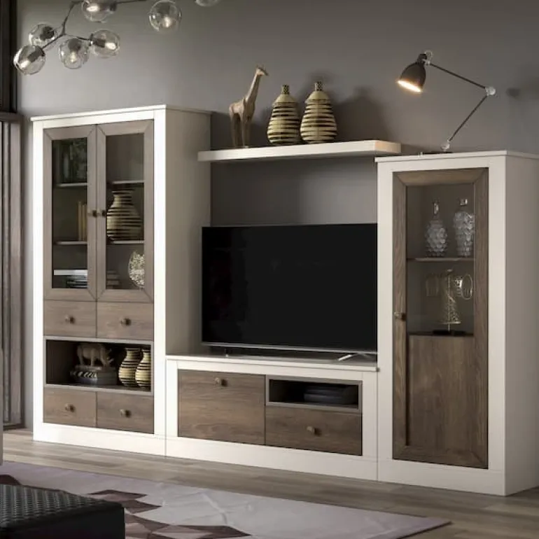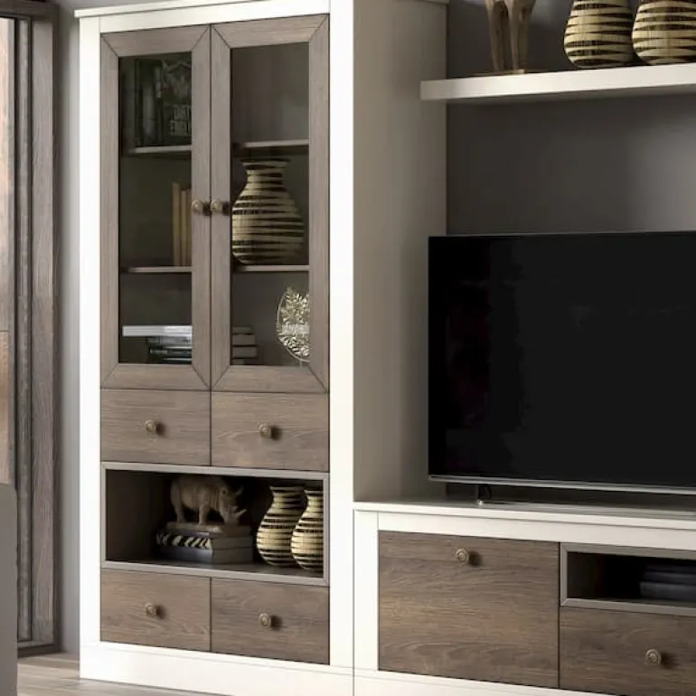 Salón compuesto por un mueble de TV con 1 cajón y1 puertaabatible, una vitrina alta con 4 cajones y2 puertas de cristal,una vitrina baja con1 puerta de cristal, y un estante de pared.Fabricado en ecomaderaRobledifuminado nº1, los marcos lacado cremaydetalles baldas interiores en lacado piedra, que le otorga un contraste muy elegante,moderno y ligero. Y si le sumamos la preciosa vitrinade cristalcon el interior del mismo acabado, nos aporta mucho más espacio de almacenaje para que puedas tener todo organizado, y el estante alto da fluidez a las diferentes alturas y completa los elementos decorativos que puedas poner junto con dentro de la vitrina.