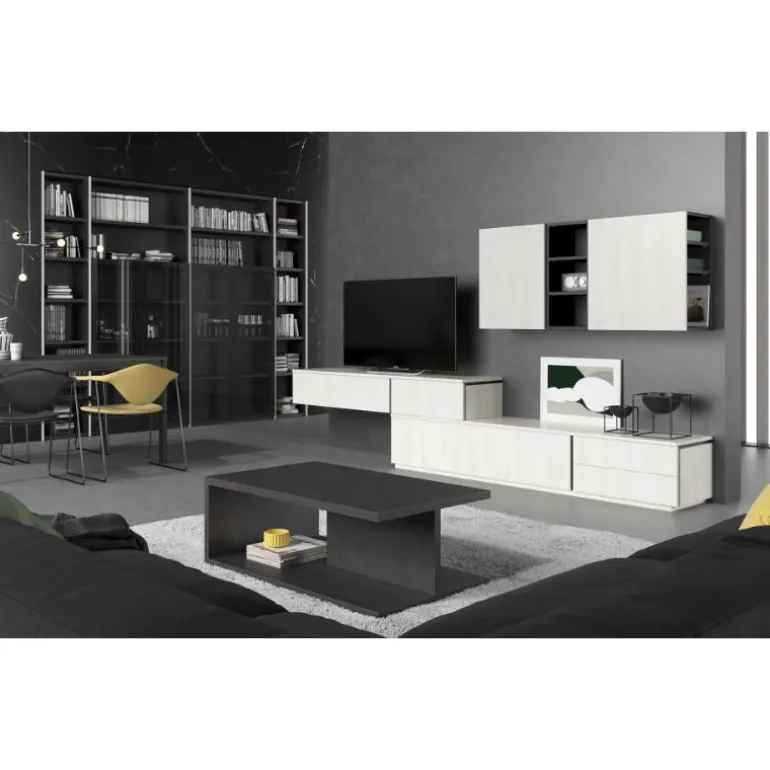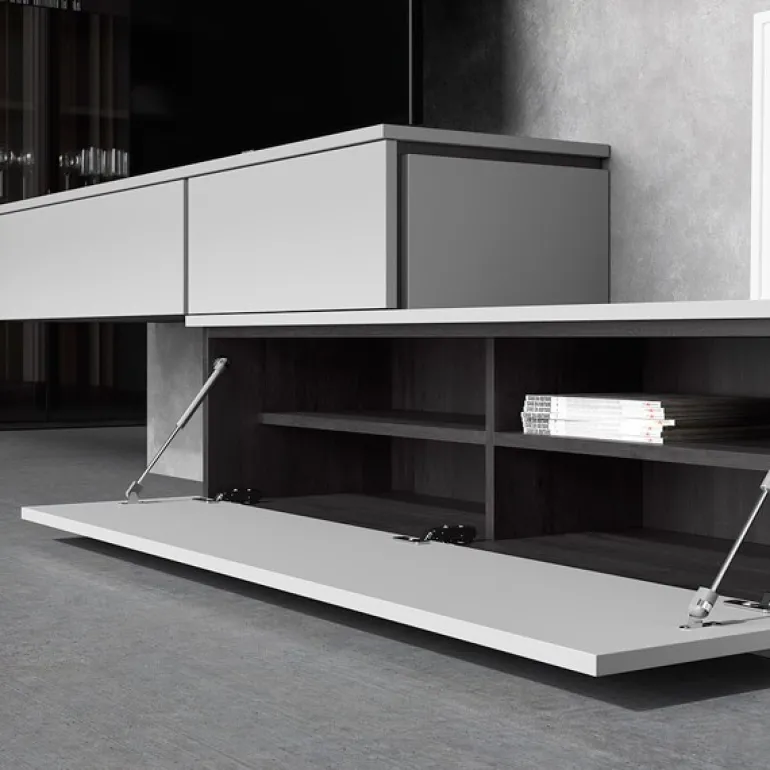 Mueble TV Bakki, mueble de salón. Composición compuesta de un módulo bajo de TV, con puerta abatible, con interior compuesto por 4 huecos independientes, montado sobre una tarima de 3 cm, módulo intermedio colgado sobre el módulo bajo, con función de apoyo para el televisor, y módulos altos con puertas y hueco central. Aperturas centrales o laterales