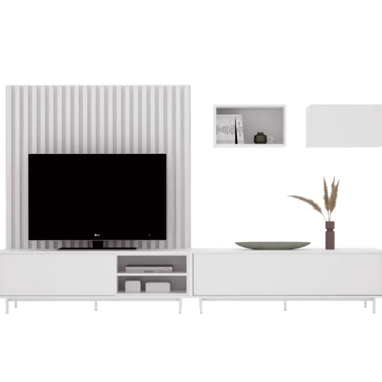 Este mueble para TV consta de 2 módulos, uno con hueco diáfano con balda interior para los aparatos electrónicos y puerta abatible, y otro con una gran puerta abatible de metro y medio. Moderno panel tras el televisor de listones de madera en el acabado que escoja, con opción de iluminación LED en los cantos laterales y superior. Y 2 módulos altos colgados con hueco diáfano y puerta elevable.