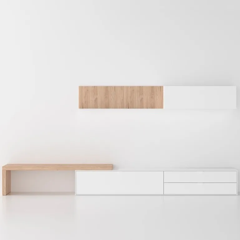 Mueble TV moderno Vor. Composición lineal compuesta de un módulo de TV de 34,8 cm de altura integrada en un sobre con apoyo lateral para soporte del televisor. En la parte superior un estante con trasera y un módulo con puerta.
