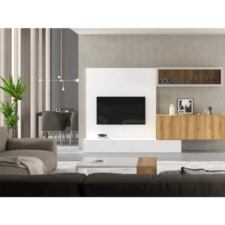 Mueble Tv Rindal, elegante composición para el salón con dos módulos de diferentes alturas, panel trasero de TV y galería de puerta elevable con vitrina.