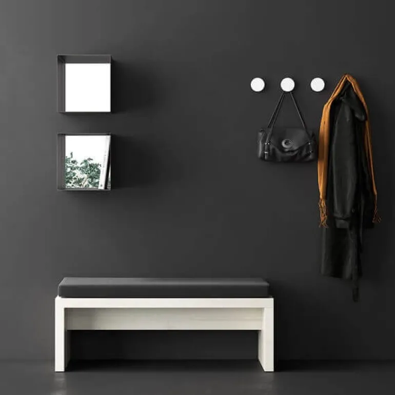 Elegante recibidor que incluye un banco de madera tapizado, dos cubos con trasera de espejo y cuatro colgadores de metal.