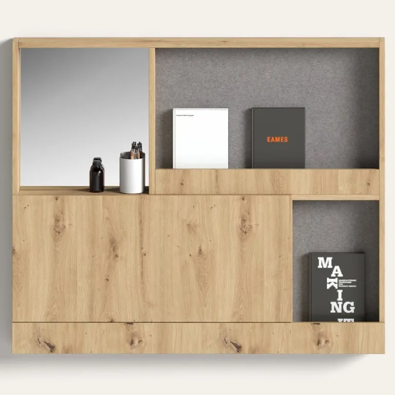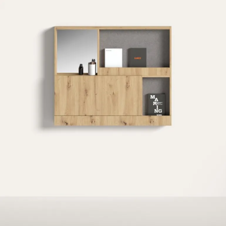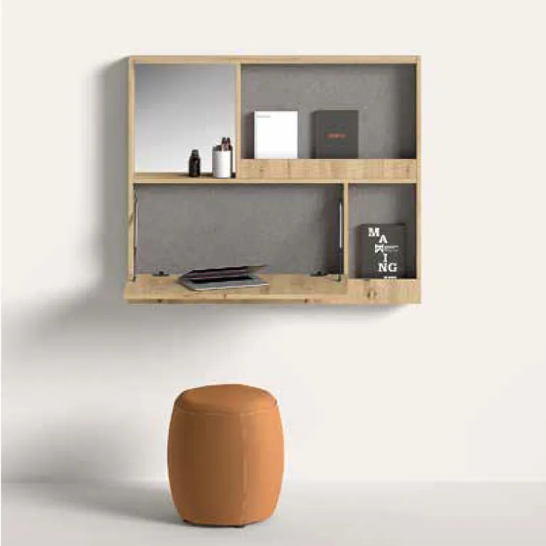 Recibidor con espejo y escritorio abatible. Recibidor muy elegante y de diseño. Con una bonita combinación de materiales en este recibidor moderno, con un escritorio abatible para deja revista, carteras, etc. y revistero / librero vertical. De 12 cm de profundo para que no ocupe mucho espacio en el recibidor, en una decoración muy moderna y actual. Y también con un espejo. En la fotografía está en ecomadera color Roble Artesano y el fondo en Cotton, pero es posible pedirlo en cualquier combinación de los colores acabados disponibles.