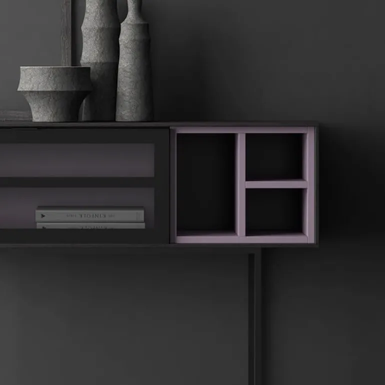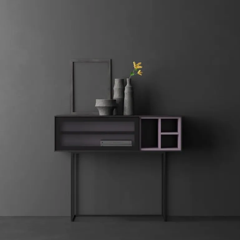 Consola para recibidor con puerta abatible vitrina con estante, hueco libre y pies de metal lacado a juego con el marco de aluminio de la puerta abatible. Diseño depurado de líneas elegantes y sencillas. Su estructura de 1 cm de grosor, aporta un estilo muy vanguardista y una fabricación sobresaliente. En diferentes acabados melamínicos en maderas o laminados lisos.