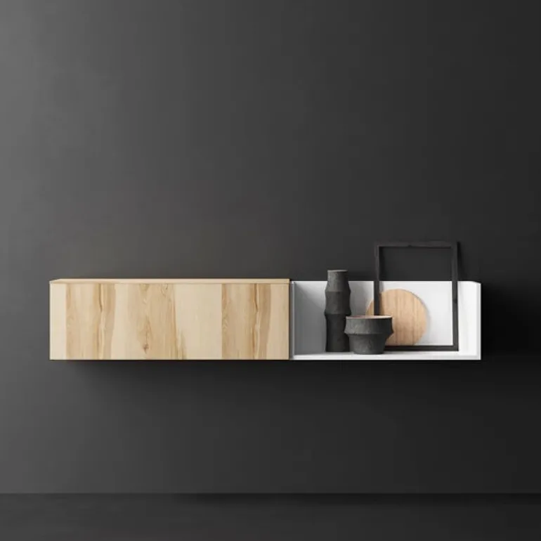 Módulos bajos y TV. Los módulos TV llevan un colgador con SISTEMA ANTIDESCOLGAMIENTO. Innovador sistema de seguridad integrado en la chapa de la pared. Una palanca elástica evita el desacoplamiento accidental del mueble de la pared. La operación de desacoplamiento voluntario es siempre posible haciendo presión en la palanca. Los tacos que forman parte de la estructura del colgador, aumentan su capacidad de carga. Capacidad de carga con certificación LGA de 120 Kg. por colgador. El herraje queda oculto bajo una tapa en la parte interior del mueble.