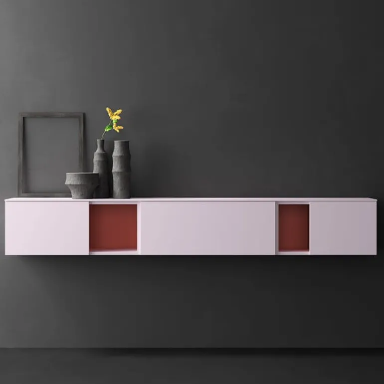 Módulos bajos y TV. Los módulos TV llevan un colgador con SISTEMA ANTIDESCOLGAMIENTO. Innovador sistema de seguridad integrado en la chapa de la pared. Una palanca elástica evita el desacoplamiento accidental del mueble de la pared. La operación de desacoplamiento voluntario es siempre posible haciendo presión en la palanca. Los tacos que forman parte de la estructura del colgador, aumentan su capacidad de carga. Capacidad de carga con certificación LGA de 120 Kg. por colgador. El herraje queda oculto bajo una tapa en la parte interior del mueble.