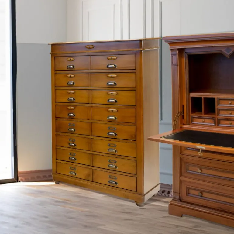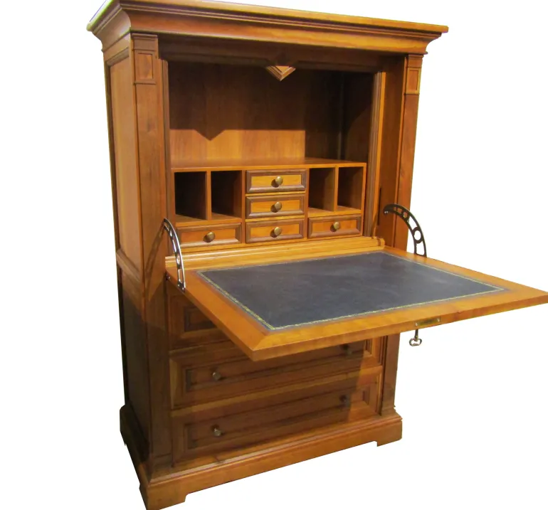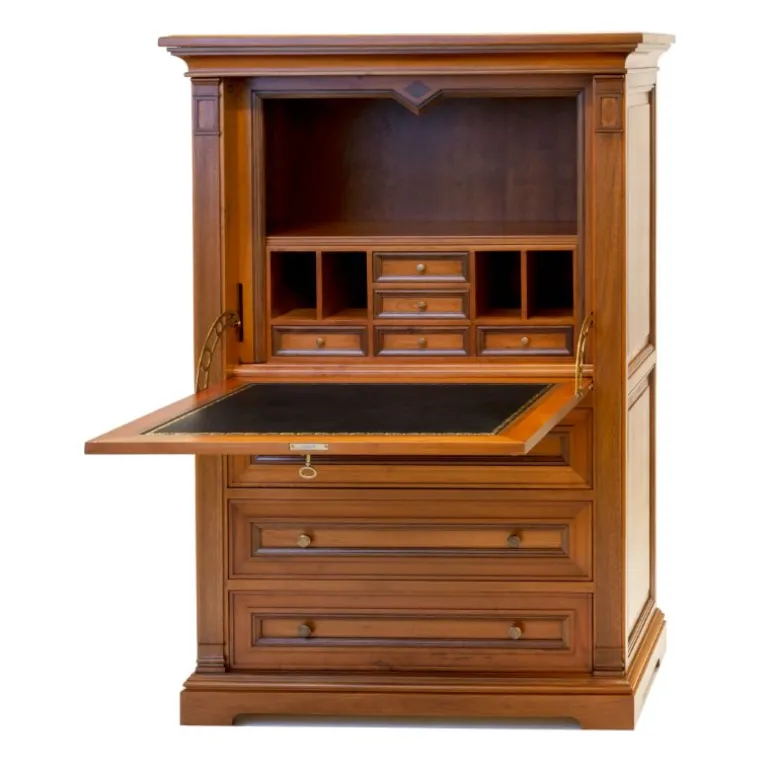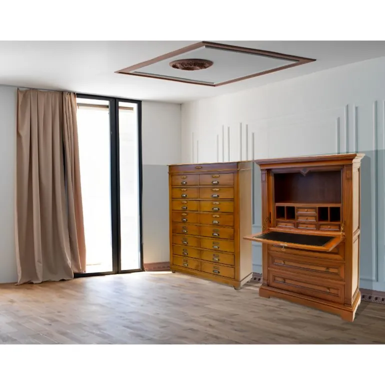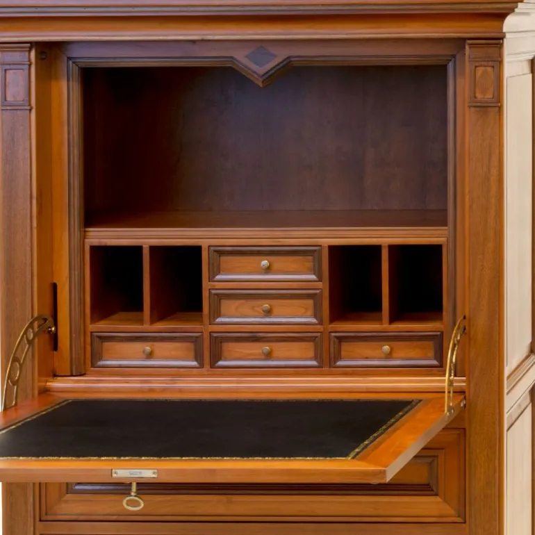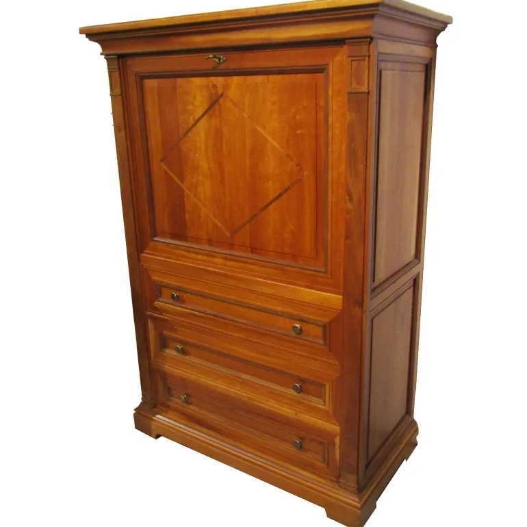 Éstesecreter esun mueble auxiliar muy funcional para aumentar la capacidad de almacenaje de tu salón-comedor. Está fabricado en madera de cerezo con incrustaciones de nogal español.
