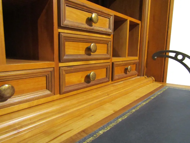 Dispone de una puerta abatible con cerradura con llave, que esconde 5 pequeños cajones y huecos para guardar lo que necesites, perfecto para usar de escritorio ya que tiene un tapete verde con ribete dorado, y donde poder tener ordenados todos tus pequeños artículos y documentos, con tiradores color oro envejecido.