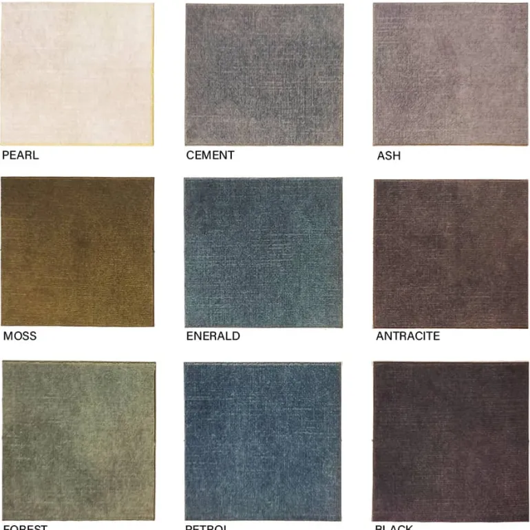 | Tapicería | Antracite, Ash, Black, Brick, Cement, Chocolate, Coral, Cuoio, Enerald, Forest, Gold, Moss, Pearl, Sand, Terra, Toffee, Truffle |