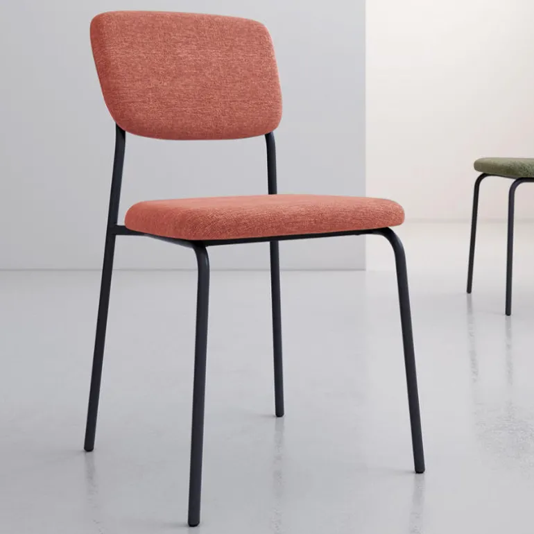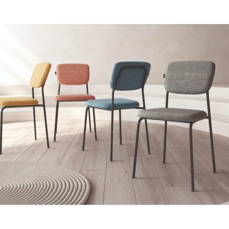 silla Bryant tapizada. Silla de comedor tapizada de patas metálicas negras muy resistente. Con un diseño muy actual, de estilo moderno, pero que encaja en cualquier tipo de decoración a la perfección. Escoge la combinación que encaje mejor con tu estilo, de las posibles combinaciones diferentes de colores: Marrón, Salmón, Mostaza, Verde, Azul, Gris Claro.