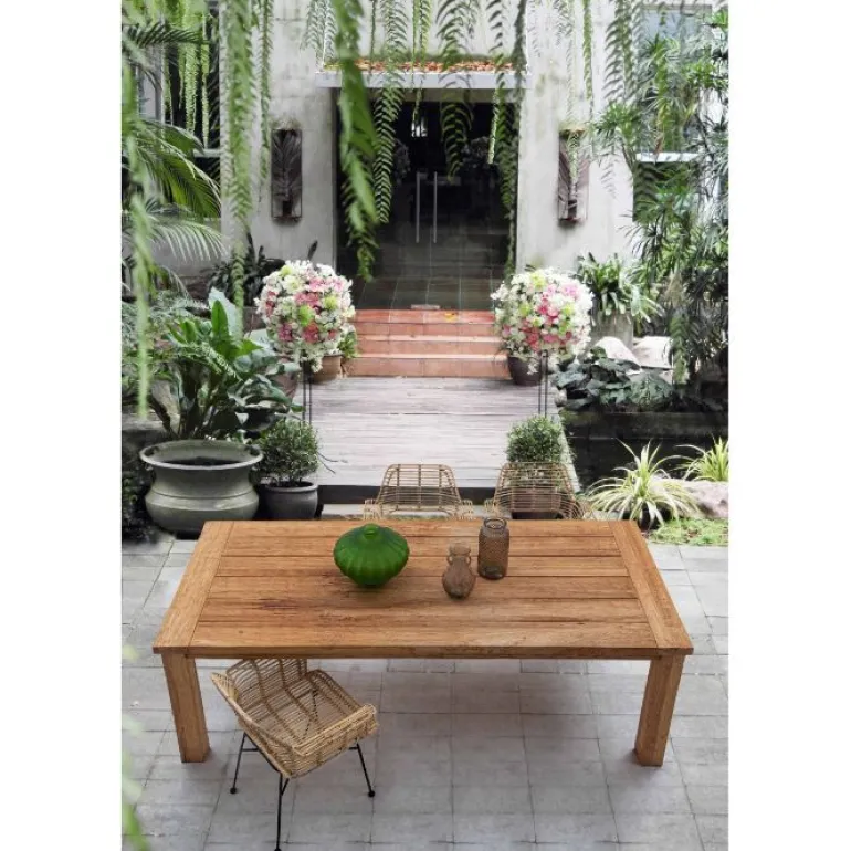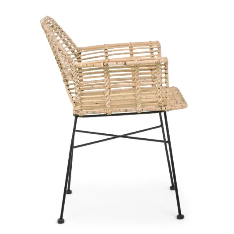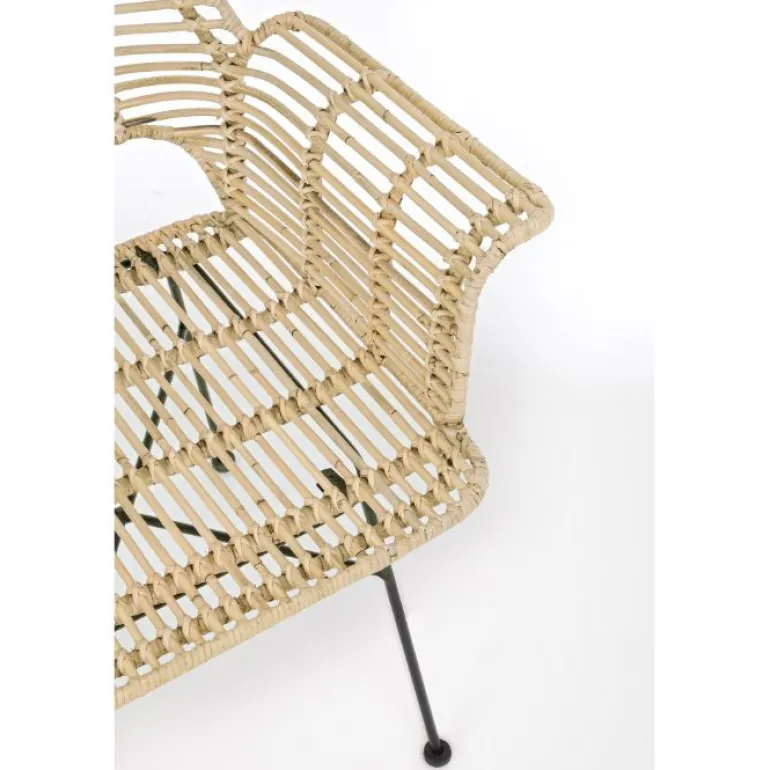 Estructura de acero con revestimento en polvo epoxy. Entramado de kubu y acabado natural con pintura melaminica, con reposabrazos que la hace muy cómoda para largas sobremesas.