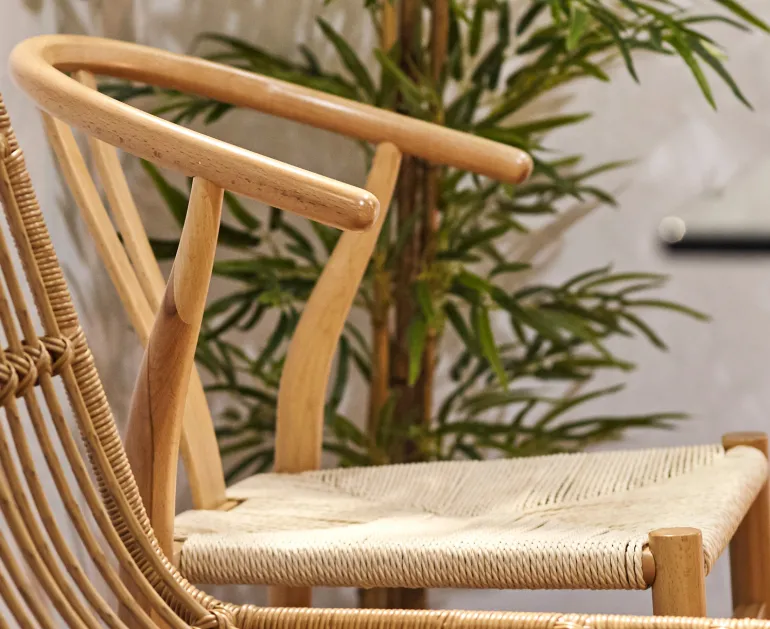 Se trata de un modelo totalmente artesanal formada por una estructura madera maciza y un asiento trabajado en rattan natural . Acabado natural, que permite ver la veta de la madera.