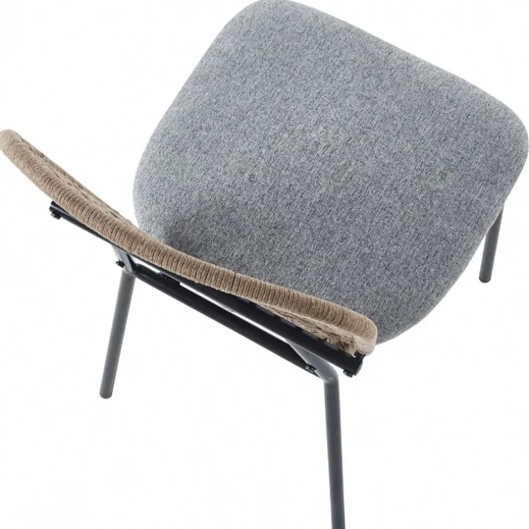 Silla de comedor de estilo industrial, con estructura de metal forjado negra. Respaldo trenzado de cuerda marrón. Asiento tapizado de 5cm en tejido gris. Una combinación de estilos clásico e industrial, combina muy bien con cualquier decoración y estilo de mueble, excelente para los estilos de comedor actuales. Con tapas de goma en la patas para evitar rallar el parqué.