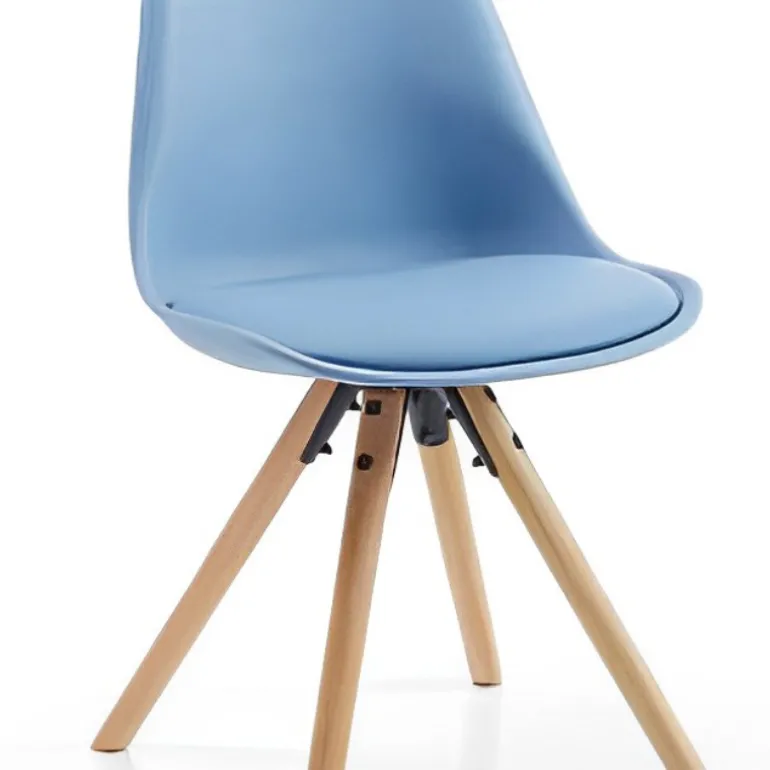 Bonita Silla Azul fabricada en polipropileno y asiento tapizado en piel sintética, muy fácil de mantener limpia, muy práctica y duradera. Las patas son de madera de haya.