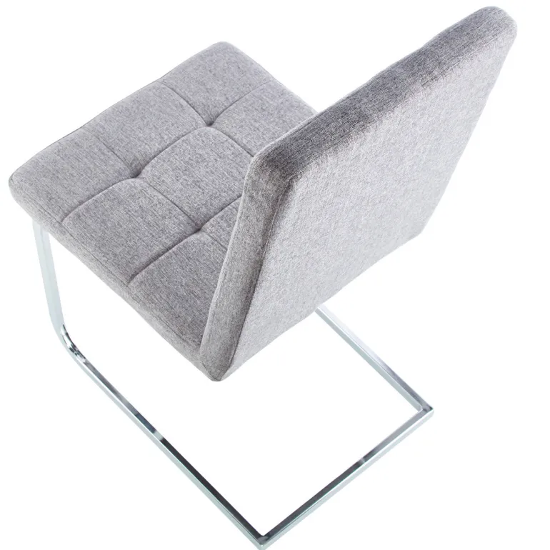 Silla de comedor moderna con cojín y respaldo alto tapizado en tejido gris, con patín metálico cromado. Muy cómoda y cálida, a la par que elegante,que combina con todo tipo de estilos. Perfecta para pasar largas sobremesas sentado en ella.