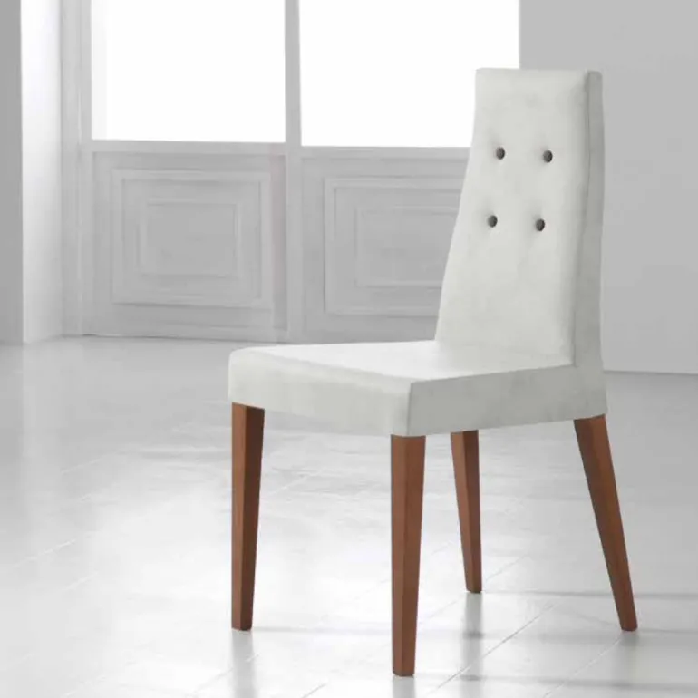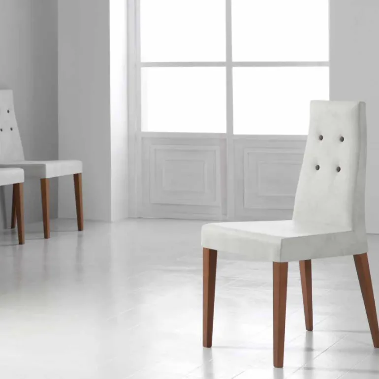 Silla de comedor en diferentes acabados en chapa de haya natural a escoger (También disponible Lacada ¡Consúltenos en [email protected]!), así cómo diferentes tapizados a escoger entre SERIE A o B, Los botones del respaldo pueden ir en el tapizado que escoja. Fabricadas en madera de Haya maciza en diferentes acabados, bonita silla que combina con cualquier mesa y perfecta para largas sobremesas y el día a día.