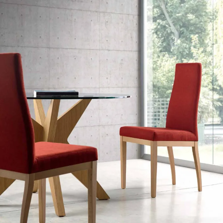Silla de comedor en acabados en haya natural a escoger (También disponible Lacada ¡Consúltenos en [email protected]!), así cómo diferentes tapizados a escoger, así cómo diferentes tapizados a escoger. Fabricadas en chapa de madera natural en diferentes acabados, bonita que combina con cualquier mesa y perfecta para largas sobremesas y el día a día.