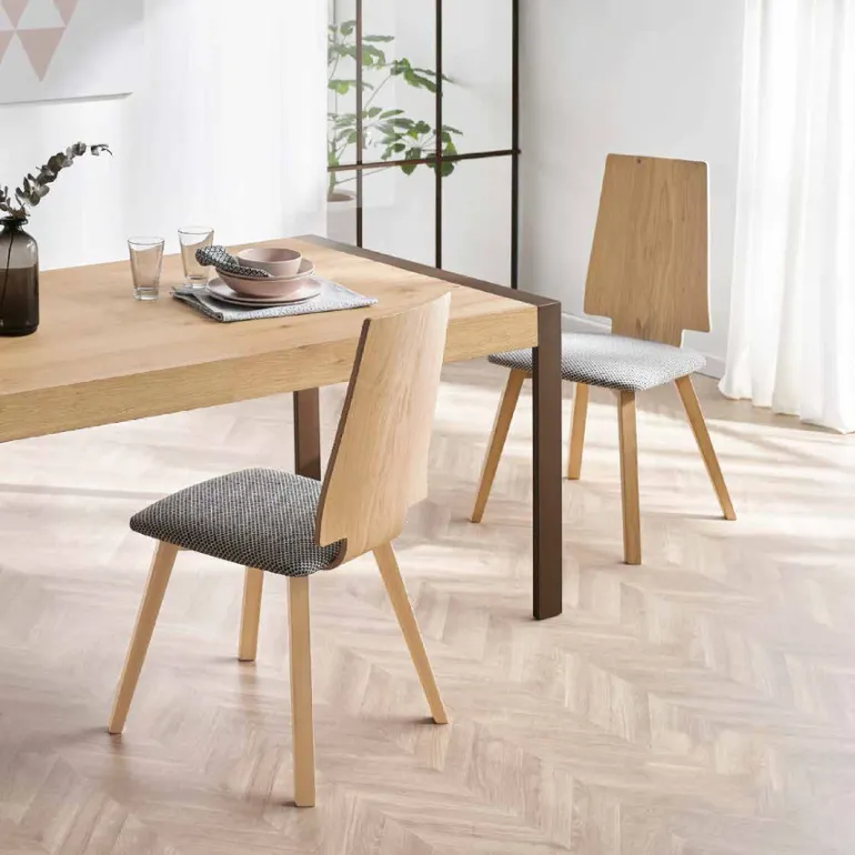 Silla de comedor con bastidor de madera de haya, en diferentes acabados en ecomadera a escoger, con opción Lacado, así cómo diferentes tapizados a escoger, bonita silla que combina con cualquier mesa y perfecta para largas sobremesas y el día a día.